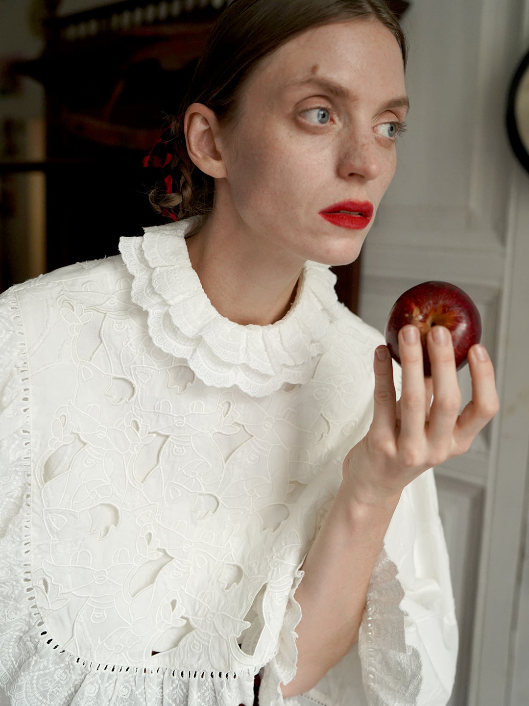 Inspired by antique Victorian shirts, this pure cotton shirt features a double-layered ruffled collar, exuding a classic freshness and romance. The embossed and structured jacquard fabric is layered with subtle, delicate cat embroidery, creating a visual masterpiece of detail. This pristine white shirt is full of possibilities and will be a must-have for your outfits!