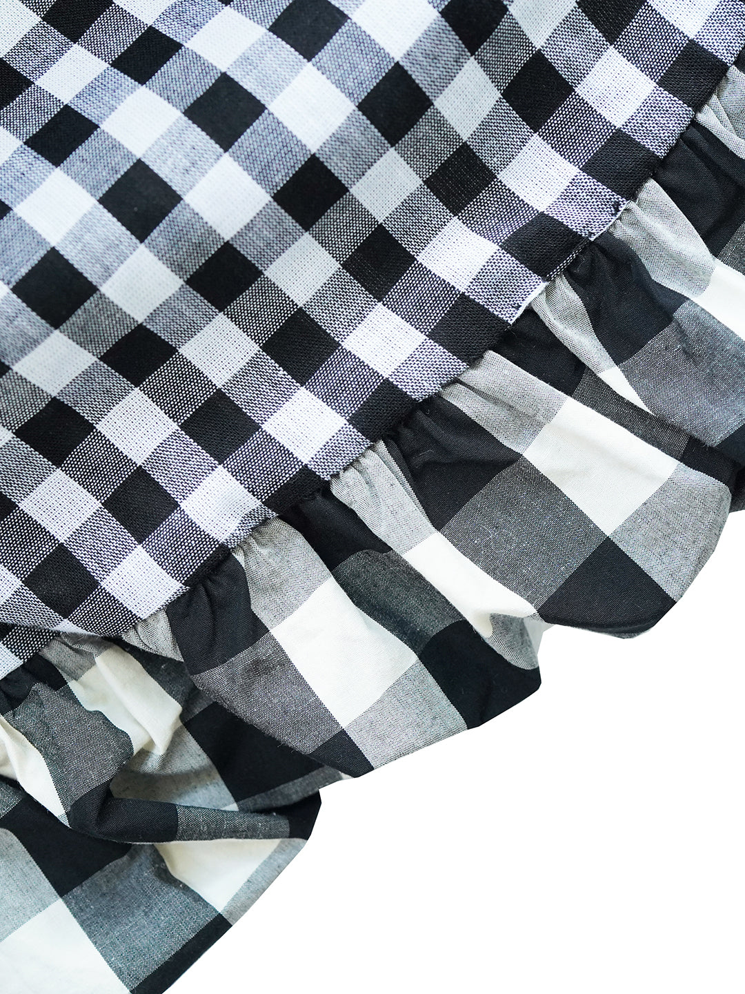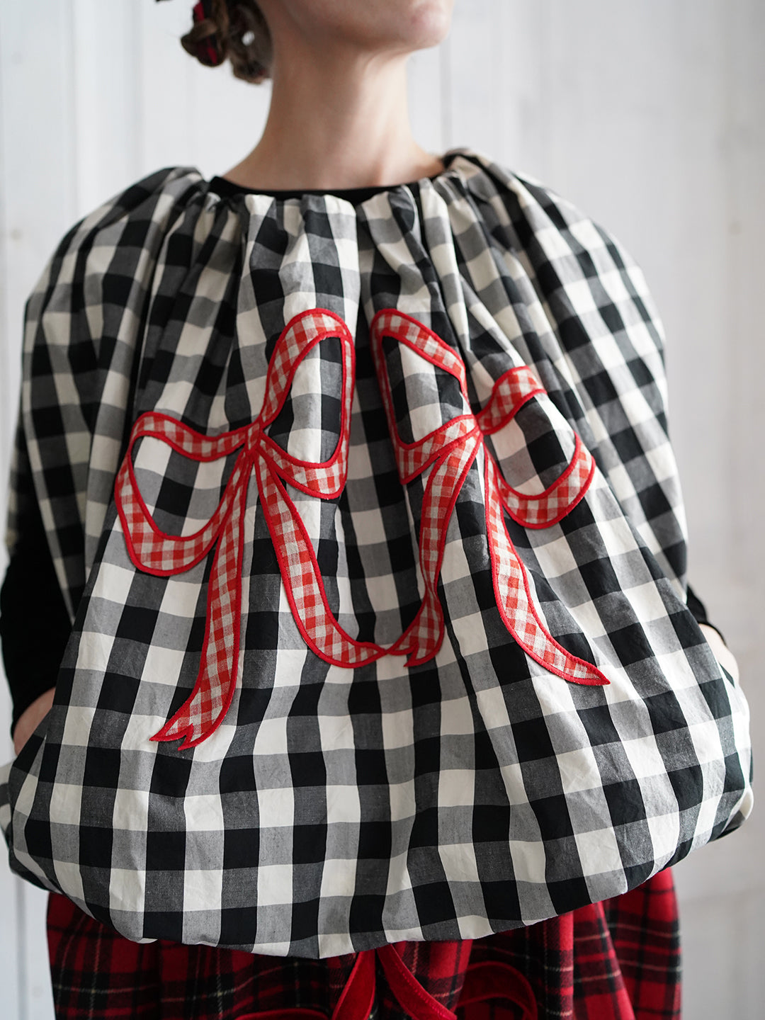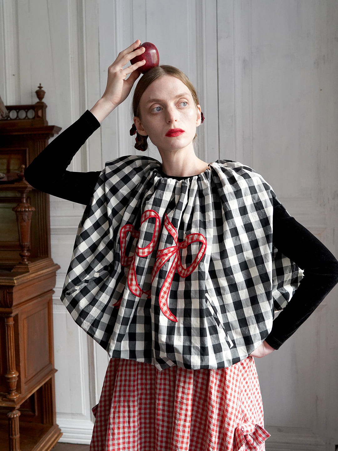 The fluffy hem flares outward like a blooming flower, creating a unique airy feel while also retaining a vintage vibe. The simple flower-bud silhouette created by the black and white checkered cotton fabric and the red and white checkered bow appliqué create a fusion of minimalism and sophistication. This versatile piece can be both a skirt and a cape, creating a truly versatile piece! It has only one size, but fits for most of people.