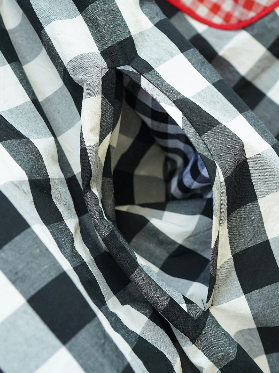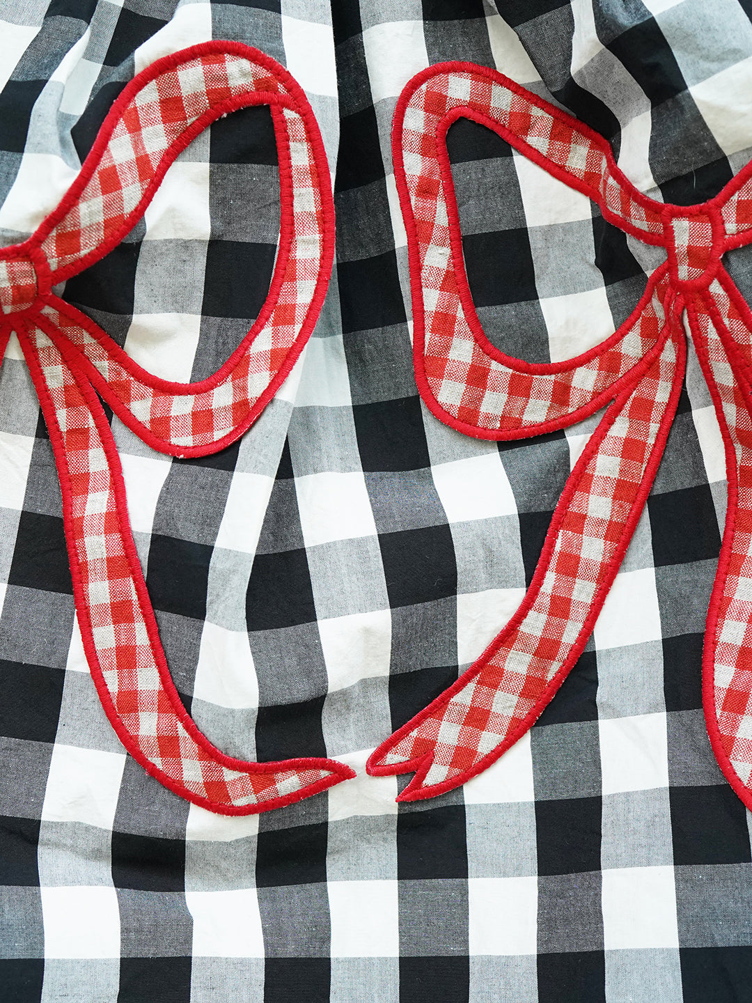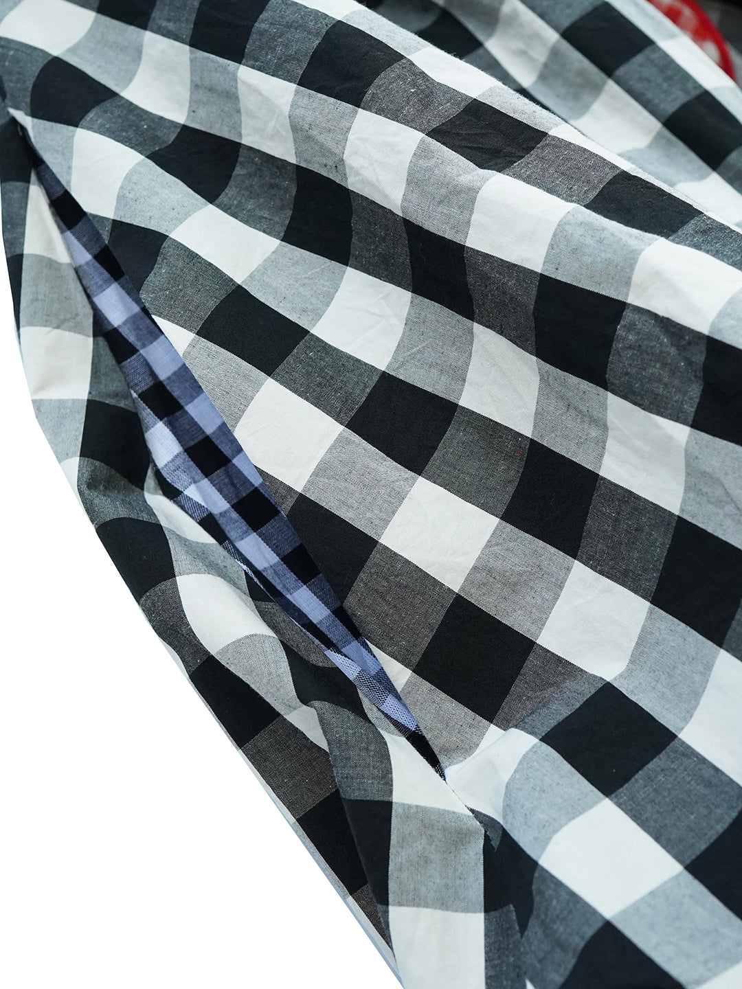 The fluffy hem flares outward like a blooming flower, creating a unique airy feel while also retaining a vintage vibe. The simple flower-bud silhouette created by the black and white checkered cotton fabric and the red and white checkered bow appliqué create a fusion of minimalism and sophistication. This versatile piece can be both a skirt and a cape, creating a truly versatile piece! It has only one size, but fits for most of people.