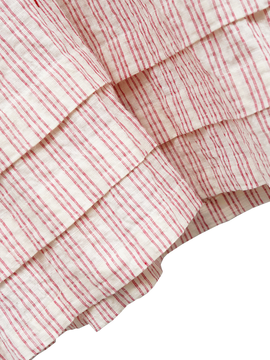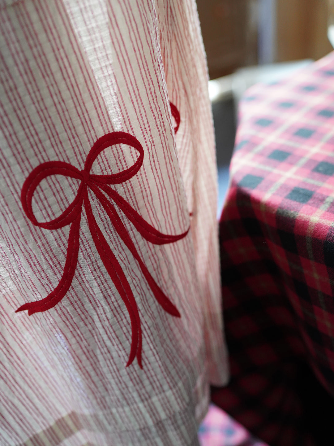 This vintage-inspired cotton-linen dress draws inspiration from the attire of Victorian antique dolls. The asymmetrical cuffs offer a fresh take on the classic gigot sleeve design, while the black bow tie and red embroidered bow add a touch of playful charm. Multiple pleats at the waist and hem, paired with a single-layered large triangular neckline, enrich the overall look and create a romantic ambiance.